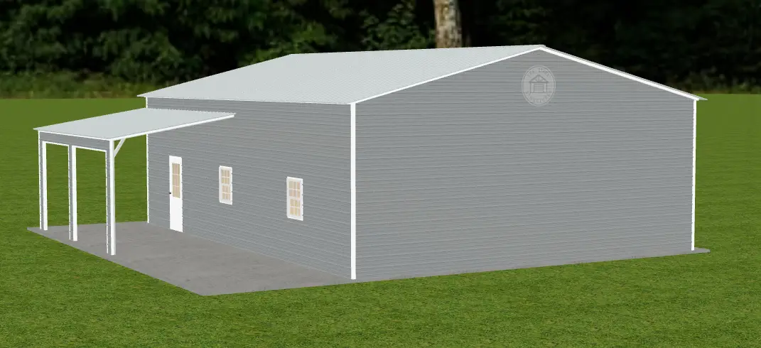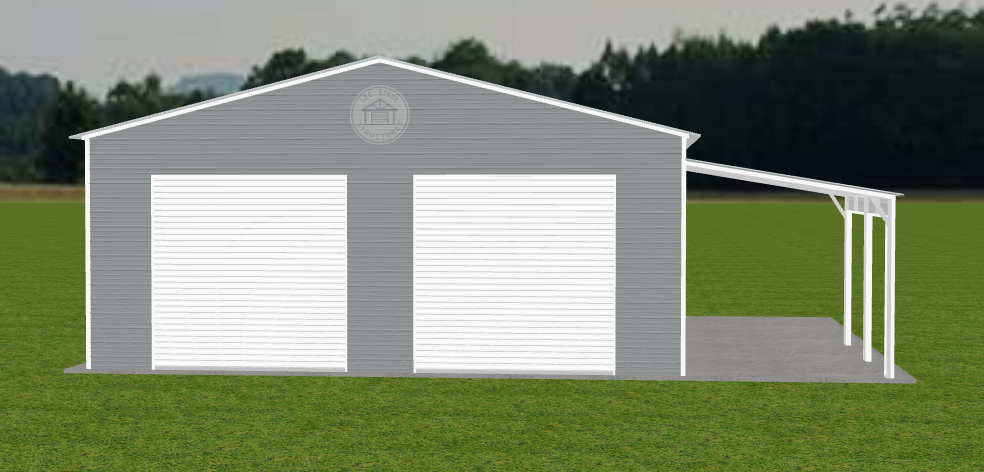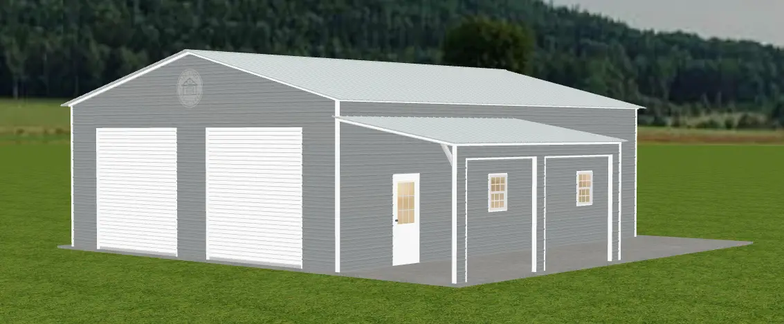 The garage also includes a 10′ x 20′ x 9′ lean-to with finished legs, two 10′ x 10′ white roll-up doors, two 30″ x 36″ grid windows, and a solid walk-in door, offering both convenience and curb appeal. Finished in Pewter Gray with White trim, this building is a stylish and practical solution—ideal for concrete installation sites.