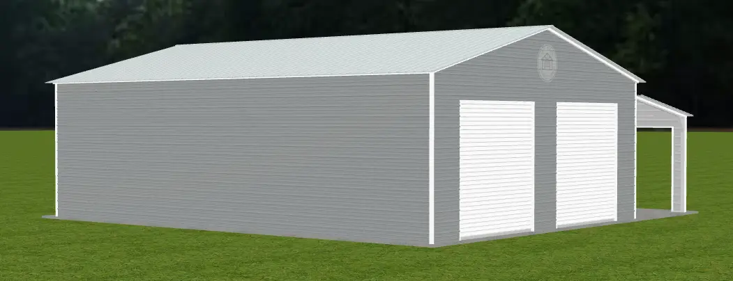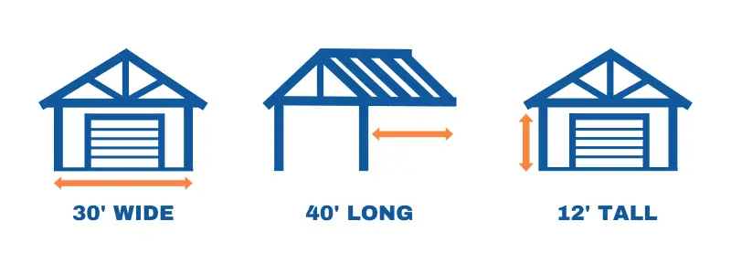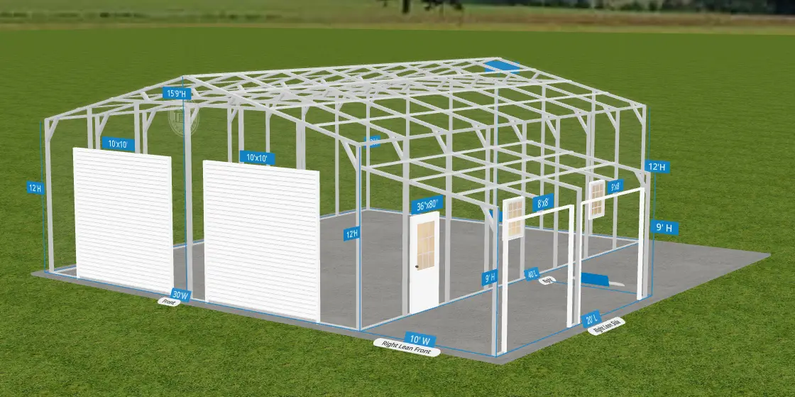 This two-car garage measures 30′ x 40′ x 12′ and features a durable vertical-style roof designed for long-term performance. Constructed from 14-gauge steel, it is engineered to withstand wind speeds up to 140 MPH and snow loads up to 30 PSF. The structure is fully enclosed with solid front, back, and side panels for added protection.