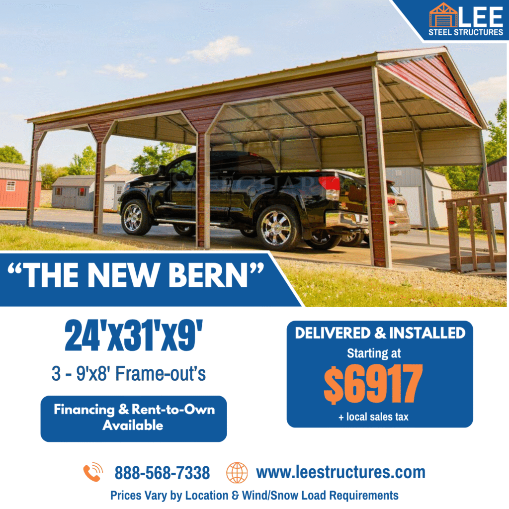 Protect your vehicles with the 24′ x 31′ Double Car Carport from Lee Structures LLC. Reach out to us today to explore customization options and receive a free quote.