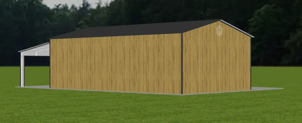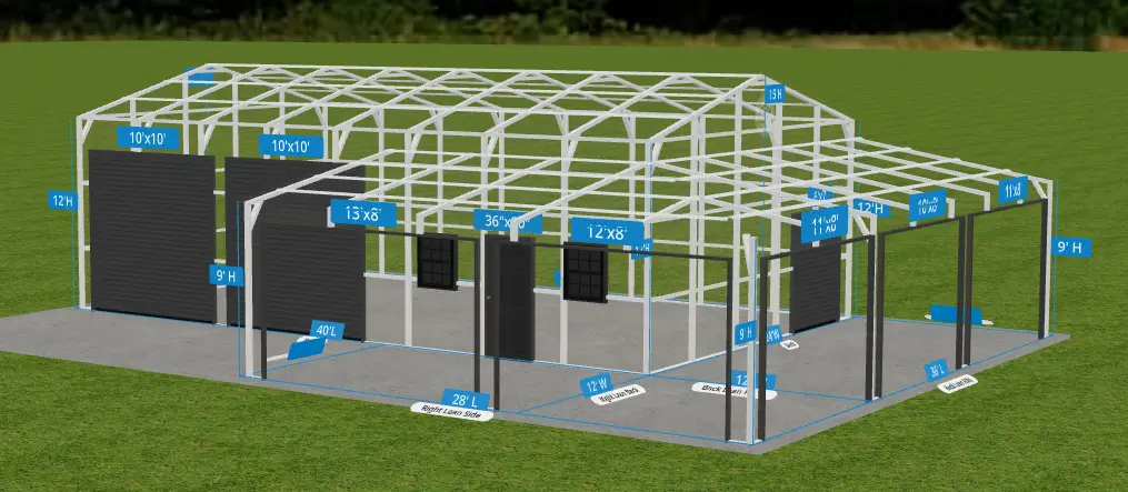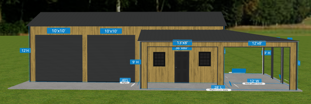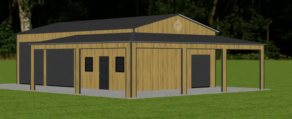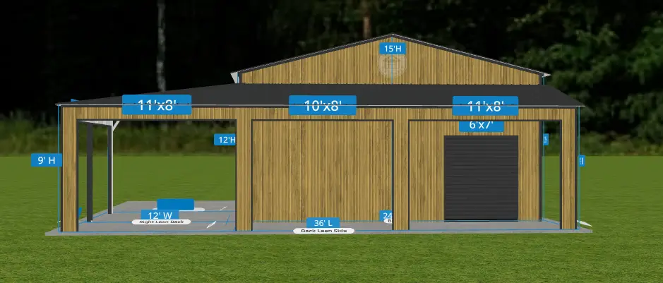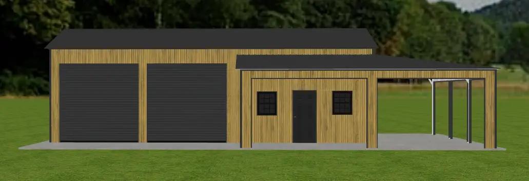 The garage also includes a Wrap Around lean-to with finished legs, two 10′ x 10′ Black roll-up doors, one 8×8 Roll-up Garage Door, two 30″ x 36″ grid windows, and a solid walk-in door, offering both convenience and curb appeal. Finished in Tiger Wood Siding with Black trim, this building is a stylish and practical solution—ideal for concrete installation sites.